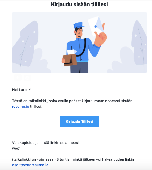 Magic Link on voimassa vain 48 tuntia. Kun linkki lakkaa olemasta voimassa, sinun pitää kirjautua uudestaan sisään sähköpostiosoitteellasi, jotta saat uuden linkin.