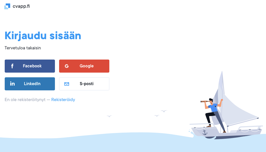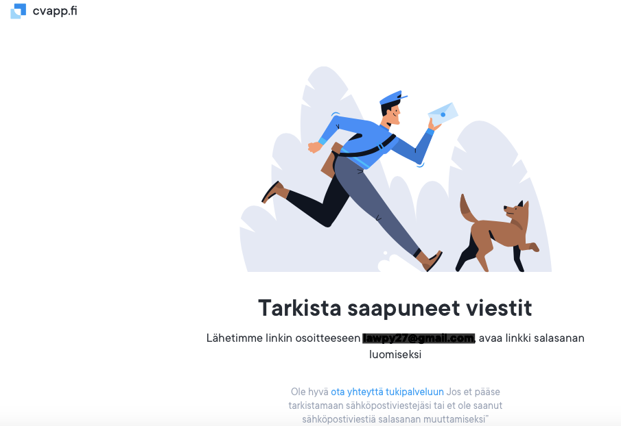 Jos sähköpostiosoitteesi hyväksytään, mutta et saa meiltä Magic Link -sähköpostiviestiä, tarkasta roskapostikansiosi tai tee Saapuneet-kansiossa haku sanalla "cvapp.fi".