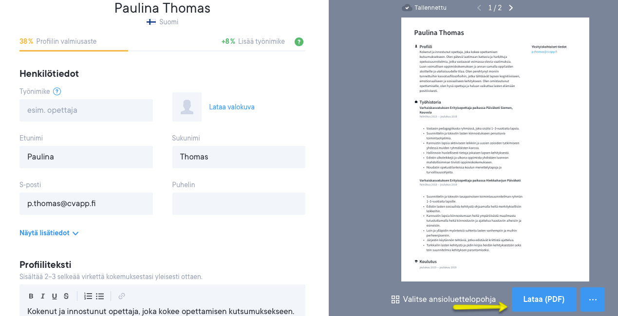 Kun alat lisätä ansioluetteloosi ja työhakemukseesi sisältöä, voit esikatsella asiakirjoja milloin tahansa esikatselusivulla. Asiakirjoihin tehdyt muutokset näkyvät esikatselussa reaaliaikaisesti.