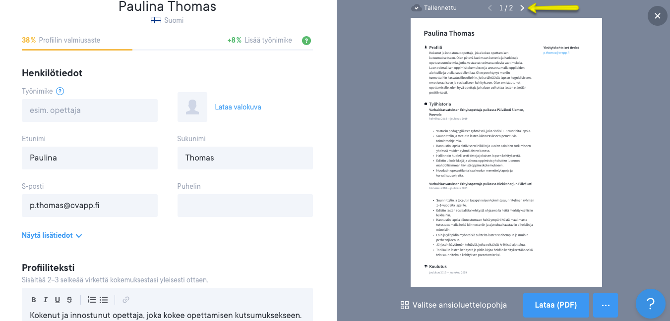 Kun esikatselet ansioluetteloa, voit näytön yläreunassa olevien nuolten avulla siirtyä kätevästi seuraavalle sivulle. Katso näyttökuva alla.
