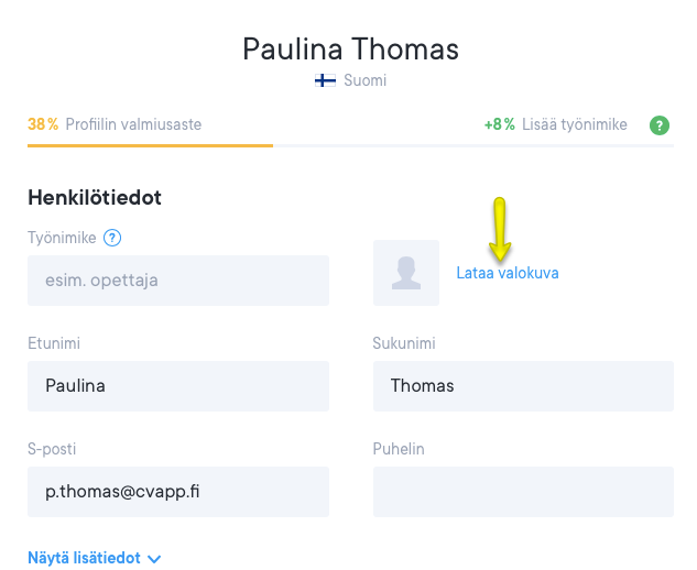 Henkilötiedot-osassa näet valintanapin valokuvan lataamiseksi. Katso näyttökuva alla.