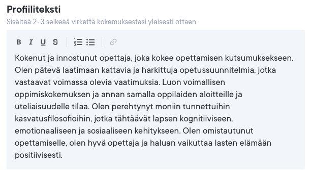 Tällä yhteenvedolla voit kiinnittää lukijan huomion itseesi 3– - 4 selkeällä virkkeellälauseella, joissa kerrot yleisesti työurastasi, sopivuudestasi työtehtävään ja tulevaisuudensuunnitelmistasi.