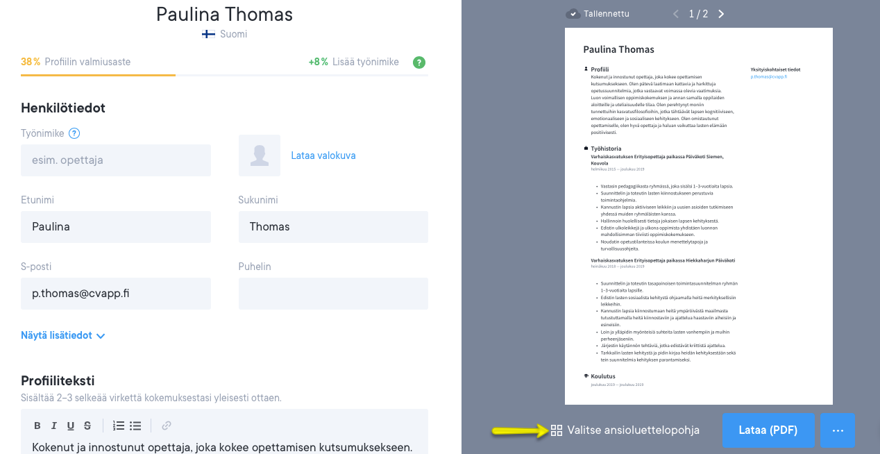 Ota käyttöön koejakso tai premium-tili, jolloin voit ladata ammattimaisesti muotoillun ja näyttävän ansioluettelon PDF tai Word-muodossa. Ansioluettelon lataaminen Word-tiedostona on uusi hyödyllinen toiminto!