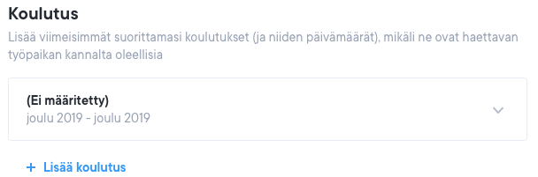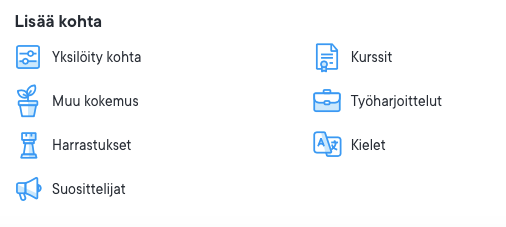 Muokkausosion alareunassa on valinnaisia osia, kuten kurssit, suosittelija, kielet, muu kokemus muu kokemus työharjoittelut.