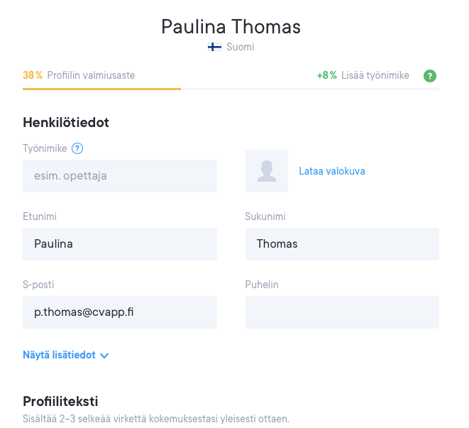 Työnimike: Hakemasi työn nimike. Tämä kenttä näkyy ansioluettelosi yläosassa, ja se on hyvä tapa mukauttaa ansioluettelo jokaista hakemusta varten.