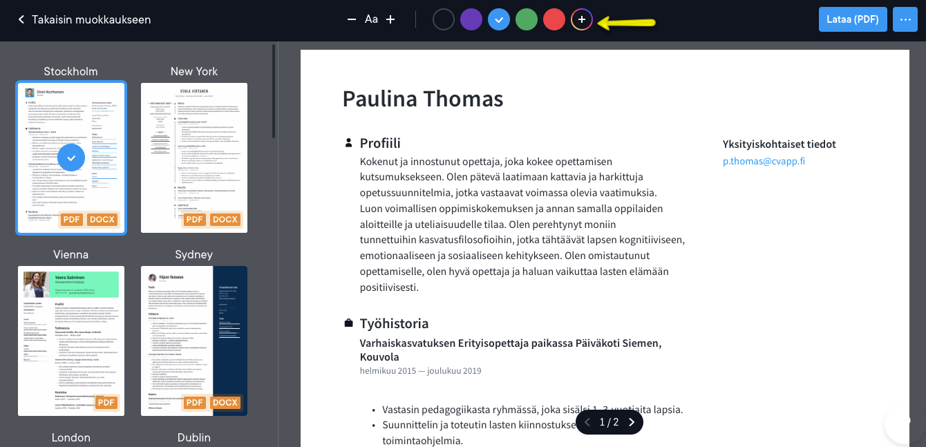 Valitse ensimmäiseksi pohja, jonka tyyli sopii toimialallesi. Älä ota tässä vaiheessa liikaa paineita siitä, minkä pohjan valitset. Kun lisäät ansioluetteloosi myöhemmin tietoja, voit muuttaa helposti ulkoasua tai järjestellä sen osia. Käytössäsi on myös värinvalintatyökalu, jonka avulla voit valita ansioluettelon korostusvärin. Yksilöllisen ansioluettelon luominen ei ole vielä koskaan ollut näin helppoa!