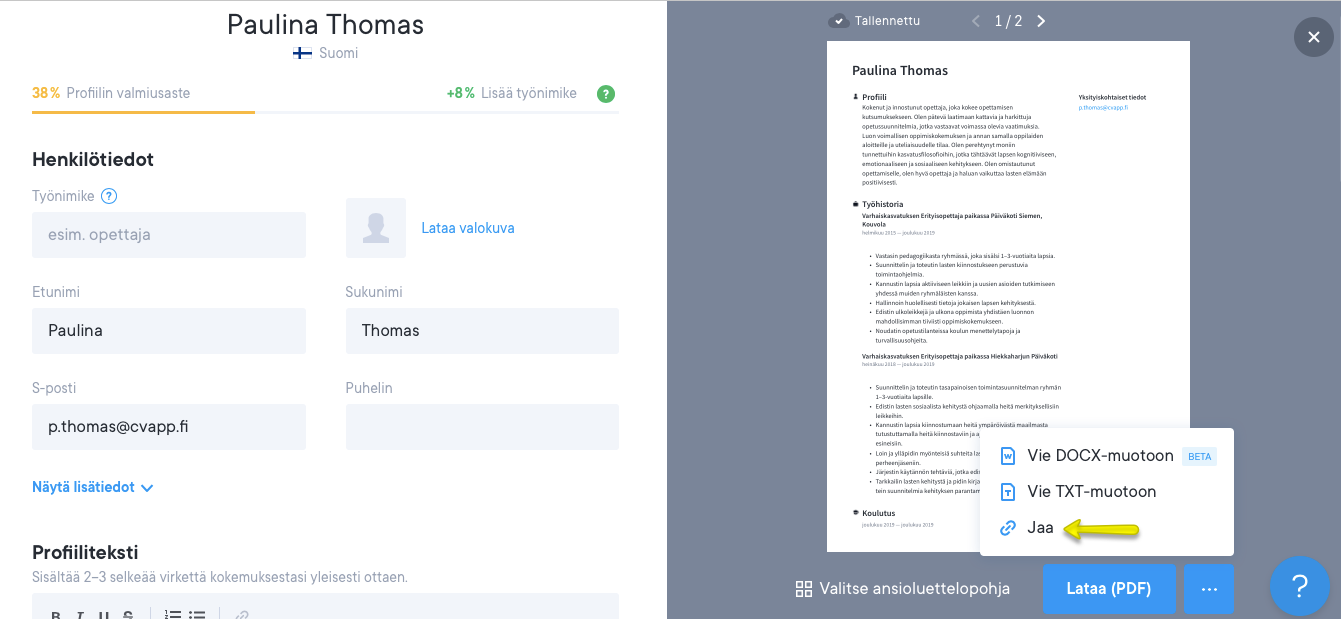 Kun ansioluettelosi on valmis, voit jakaa cvapp.fi-sivuston välityksellä verkkolinkin ansioluetteloosi – ilmaiseksi. Ansioluettelosi on oletusarvoisesti yksityinen, ja se jaetaan vain, jos itse valitset jakamistoiminnon. Voit helposti ladata työhakemuksesi PDF-tiedostona, jonka voit tallentaa tai lähettää työnantajalle.