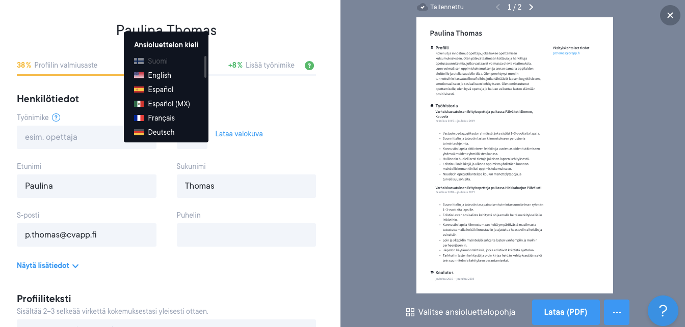 Voit muuttaa ansioluettelosi tai työhakemuksesi kielen milloin tahansa. Tuemme tällä hetkellä seuraavia kieliä: English, Русский, Nederlands, Español, Svenska, Dansk, Norsk, Duetsch, Français, Português, Italiano, Polski, čeština, Suomi, 中国人 ja Hindi.